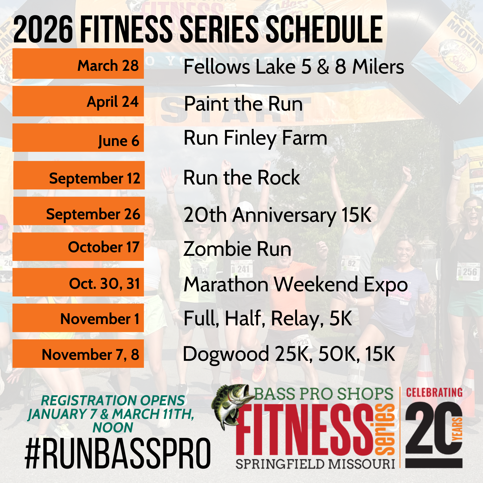 2026 finds the Bass Pro Fitness Series celebrating its 20th year. Over 33,000 people participated in our events as runners, walkers, bikers, spectators and volunteers in 2025. Over the course of 19 years, we have impacted over 710,000 participants, volunteers, neighborhood groups, charities, spectators, businesses and organizations. The Bass Pro Shops Fitenss Series is committed to helping our community achieve their fitness goals while connecting people with the beauty of the Ozarks.